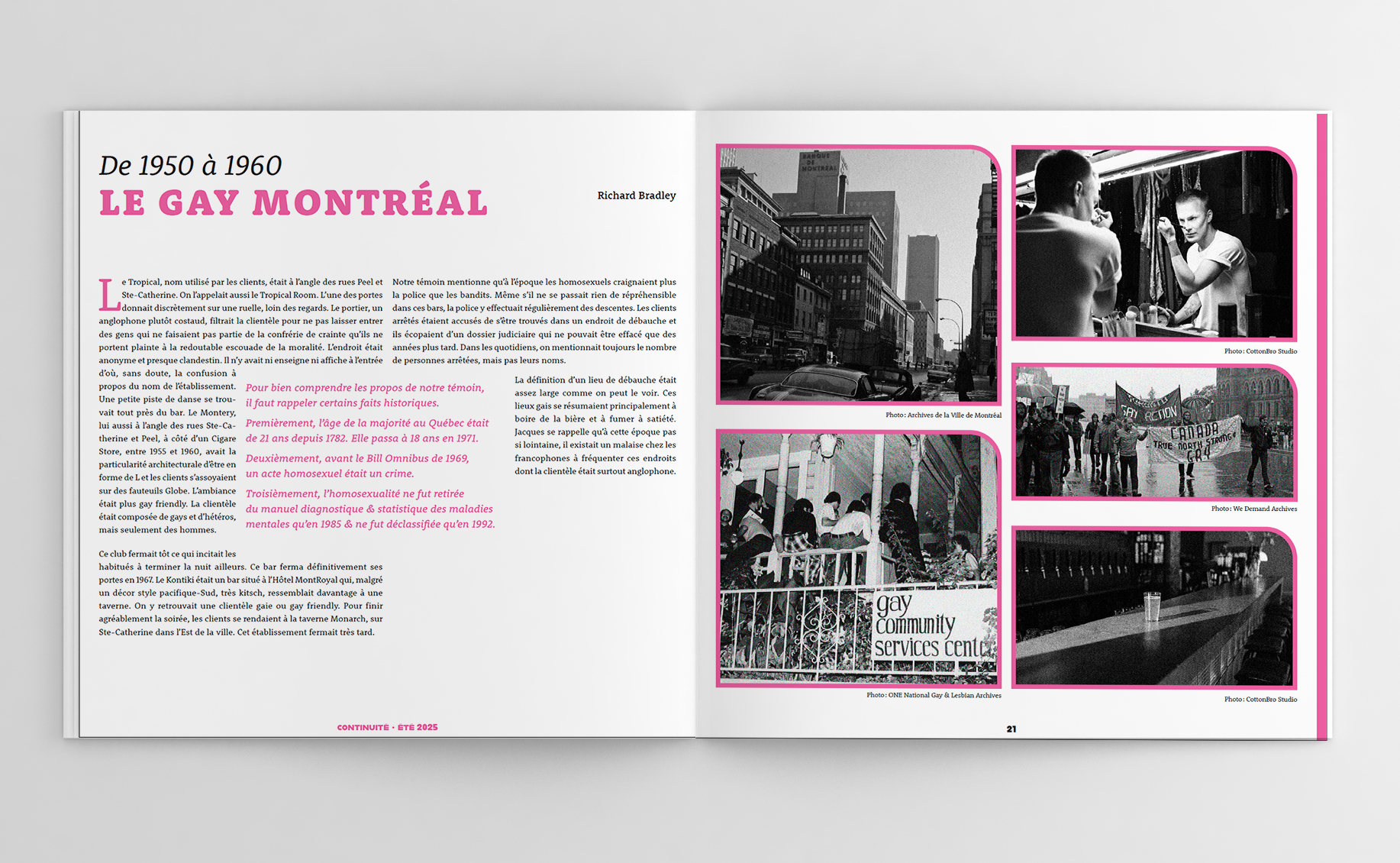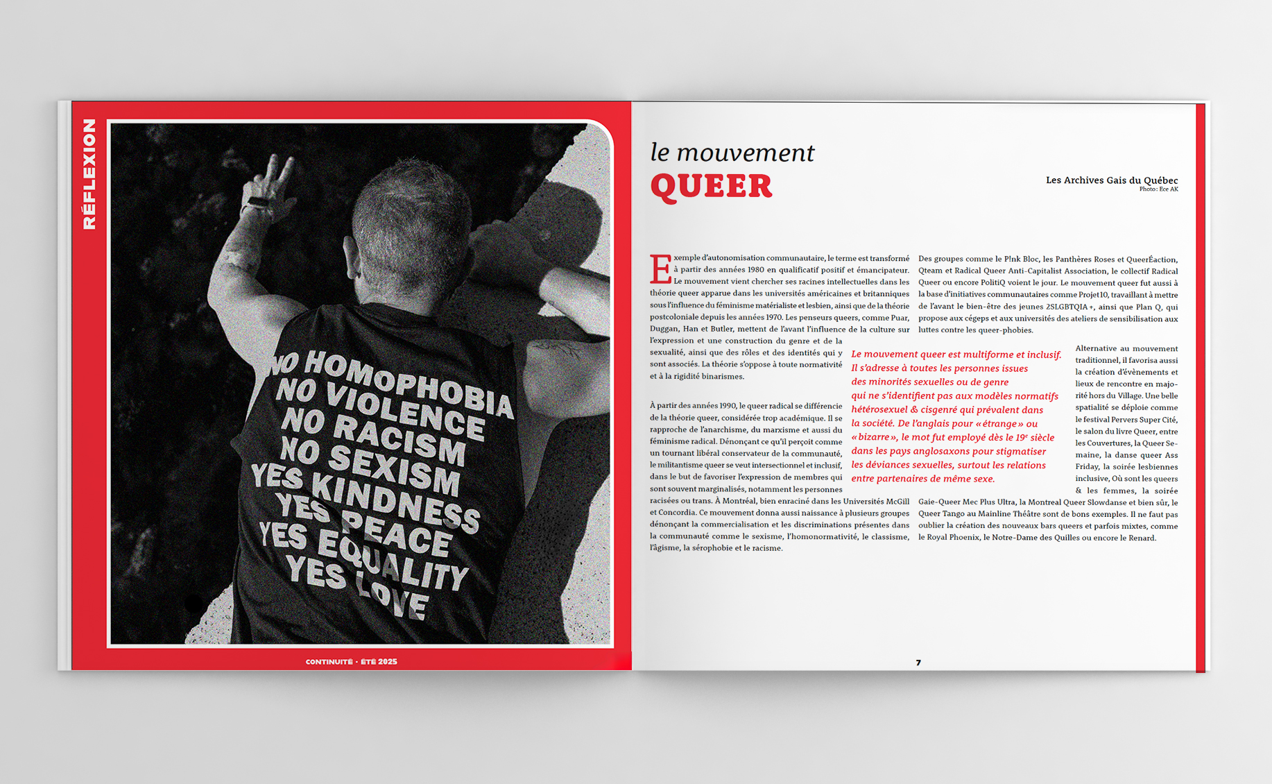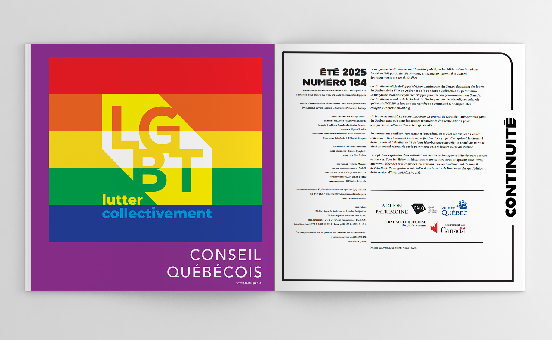 Afin d’actualiser son image et d’élargir son propos, j’ai imaginé une édition dédiée à la culture et à l’histoire LGBTQ+ au Québec. Cette édition vise à souligner l’importance de la mémoire queer dans le paysage patrimonial québécois, en mettant en lumière des lieux, des figures marquantes et des initiatives communautaires.
