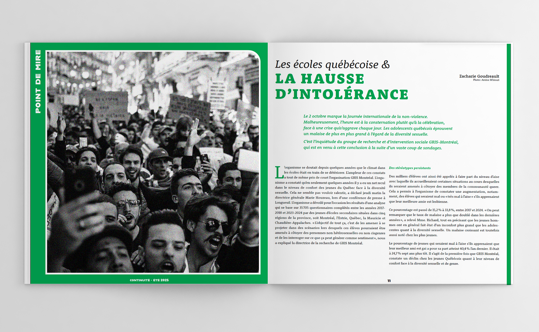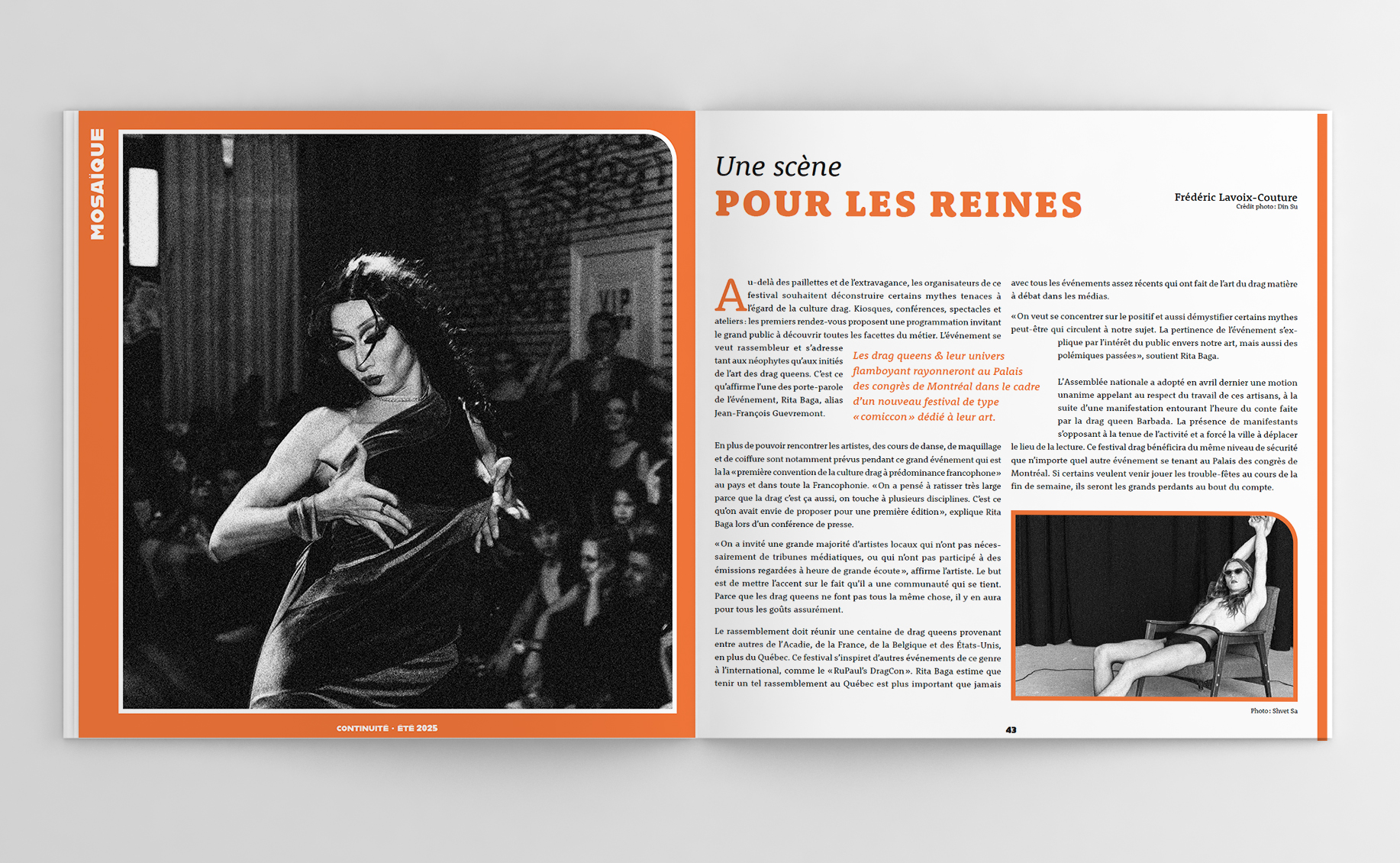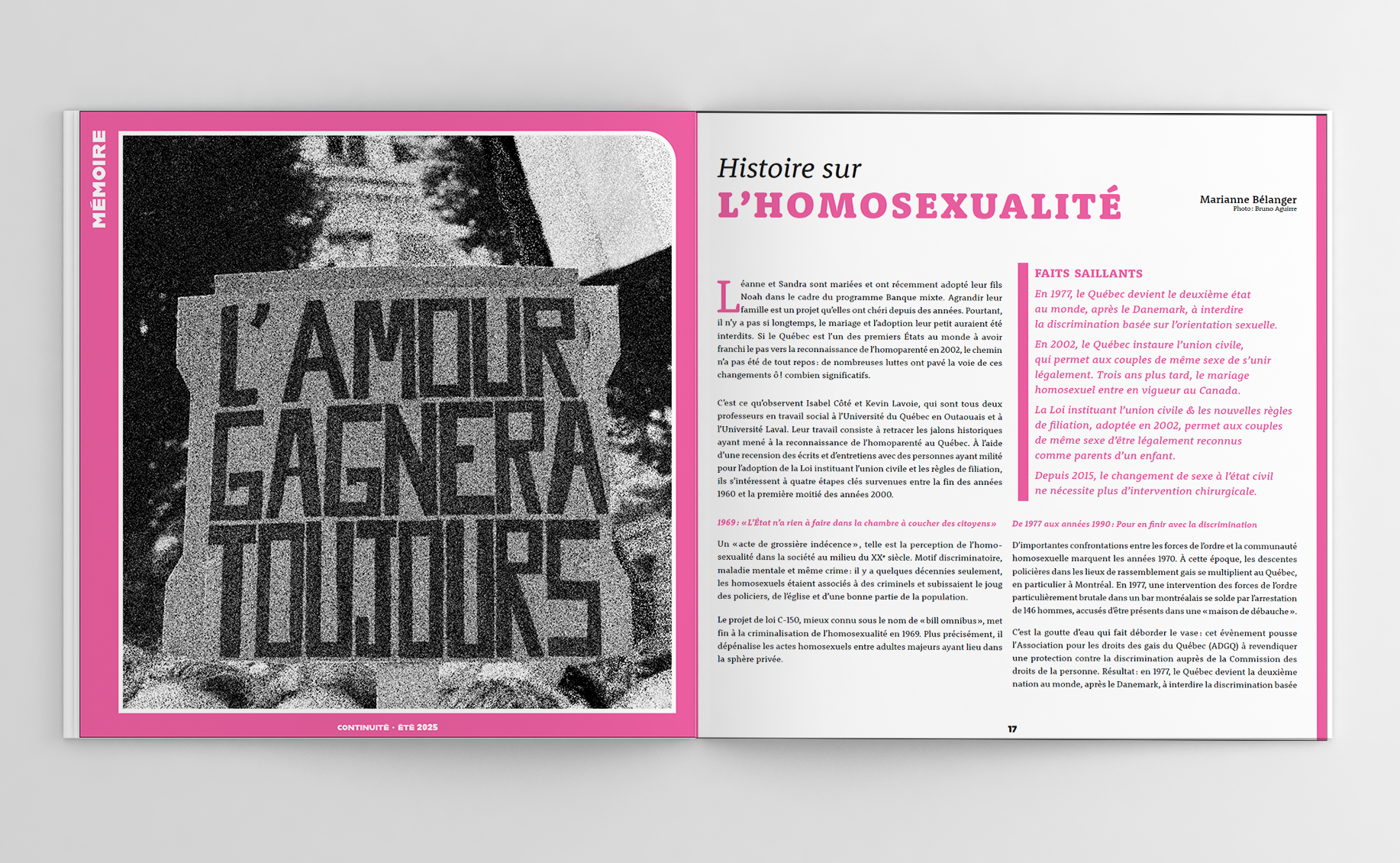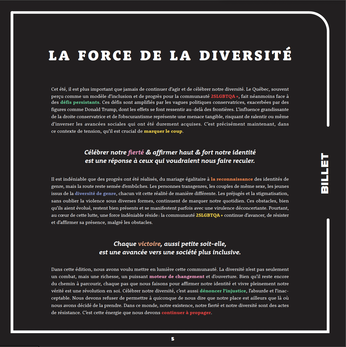 Afin d’actualiser son image et d’élargir son propos, j’ai imaginé une édition dédiée à la culture et à l’histoire LGBTQ+ au Québec. Cette édition vise à souligner l’importance de la mémoire queer dans le paysage patrimonial québécois, en mettant en lumière des lieux, des figures marquantes et des initiatives communautaires.